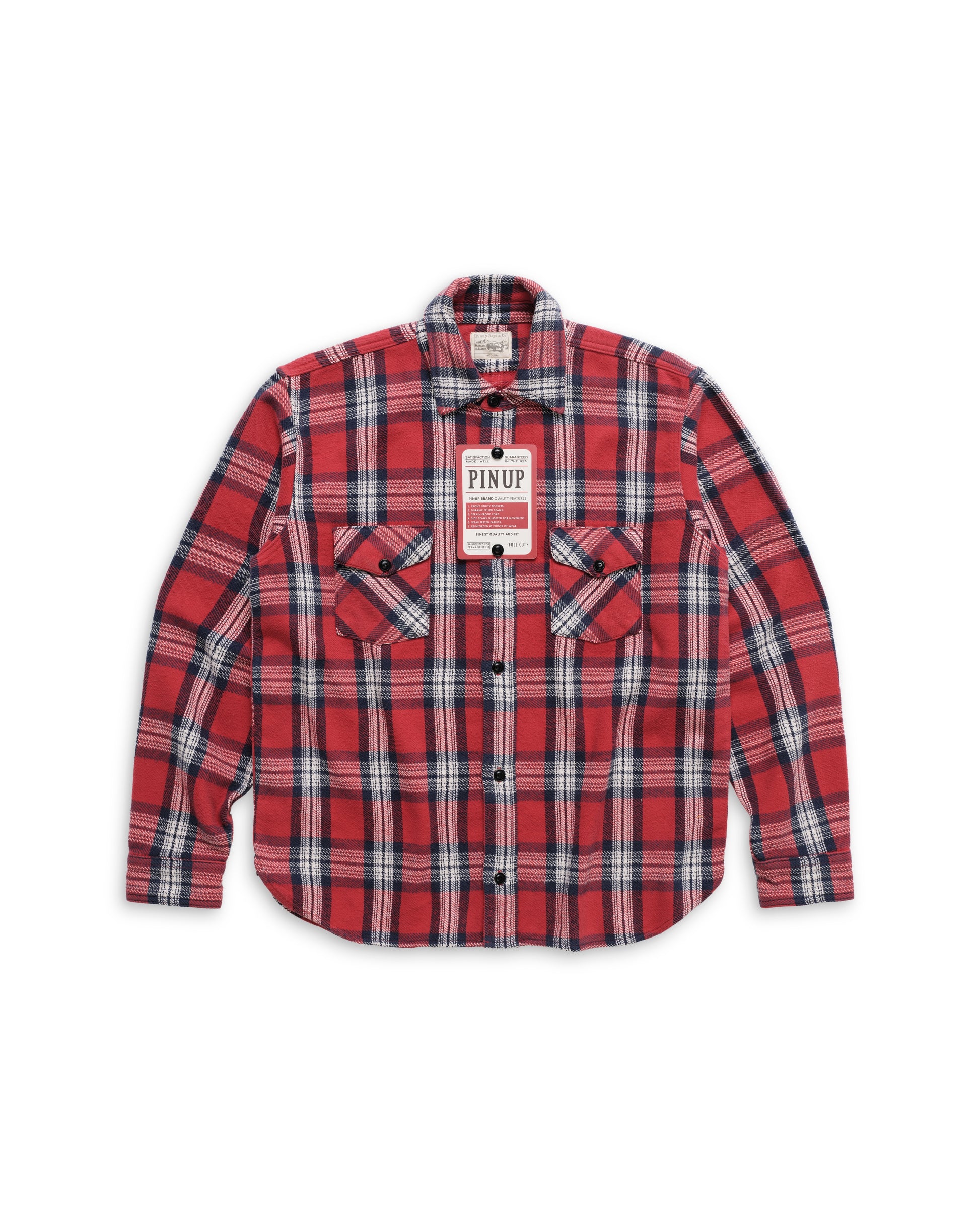 Traditional work shirt made from a heavyweight all-cotton imported Japanese woven flannel. Full bodied cut for movement. Finished with a full button up front, closed with period correct corozo button fastenings. Gusseted side seams ensure extra strength between front and back panels. Front pockets feature angled pocket flaps. Full length sleeve with placket and rounded cuff.